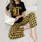 Upgrade your nightwear game with our Black and Yellow SIMBA print T-shirt and Printed Pajama Full Sleeves Night Suit! Made for her, this stylish and comfortable set will add a touch of fun to your bedtime routine. Made with high-quality materials for a perfect fit.
